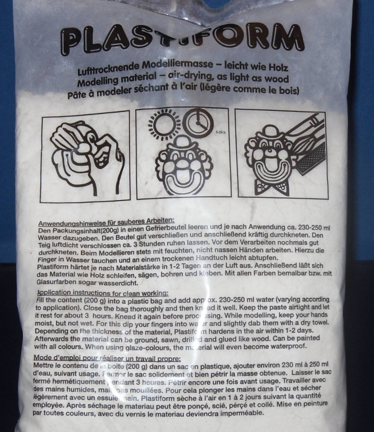 1 Beutel Plastiform Plastiform ist nach Zugabe von Wasser eine sehr geschmeidige Modelliermasse, die an der Luft trocknet. Viel Spaß beim Bauen!